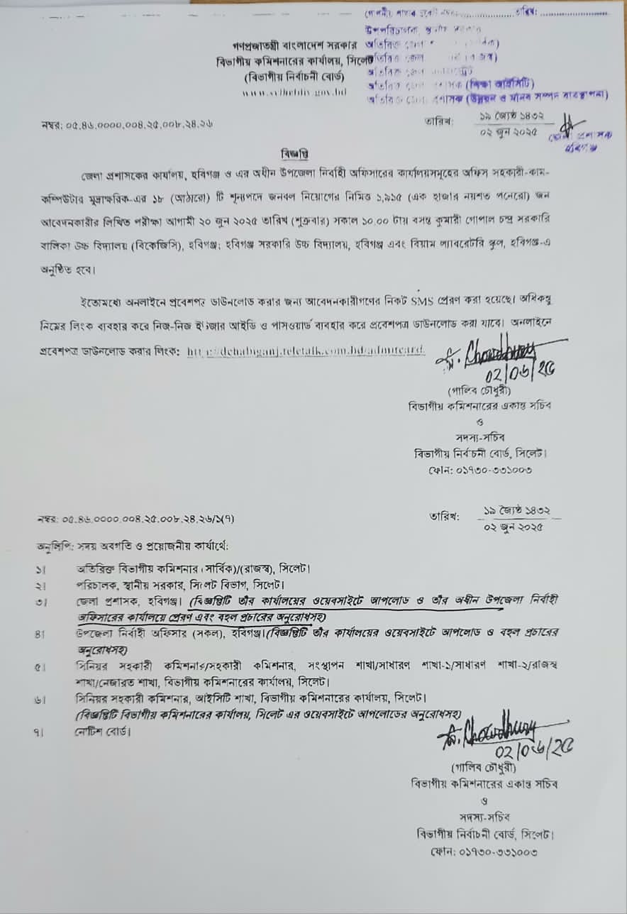 | ৬ | উপজেলা নির্বাহী অফিসারের কার্যালয়সমূহের অফিস সহকারী কাম-কম্পিউটার মুদ্রাক্ষরিক এর লিখিত পরীক্ষার সময়সূচি। | | | ০৫-০৬-২০২৫ | দেখুন |
